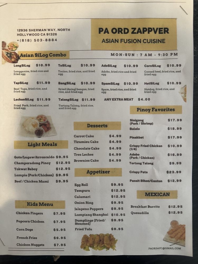 Welcome to Pa Ord Zappver / Asian Fusion Cuisine, where flavors from Thailand and the Philippines unite to create an unforgettable dining experience. Nestled in North Hollywood, this vibrant eatery showcases a menu packed with enticing offerings. From appetizers like the crispy Egg Roll Veggie and savory Dumplings to hearty Filipino classics such as Adobo and Crispy Pata, there’s something for everyone.